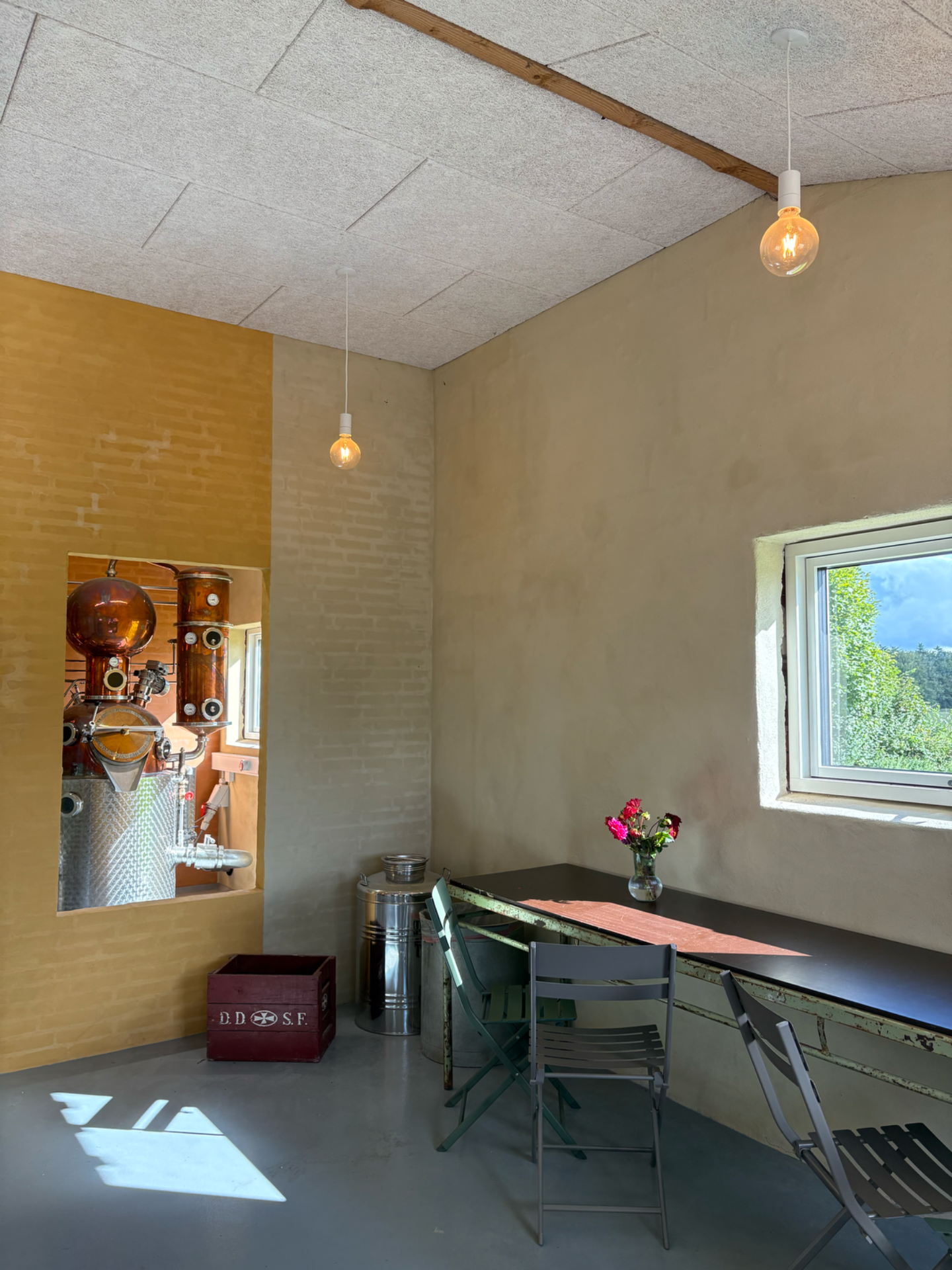 Fra gårdbutikken, gennem et stort vinduesprati, kan vores smukke Müeller destilleri beundres, det er lige der magien sker og vores gin bliver til.